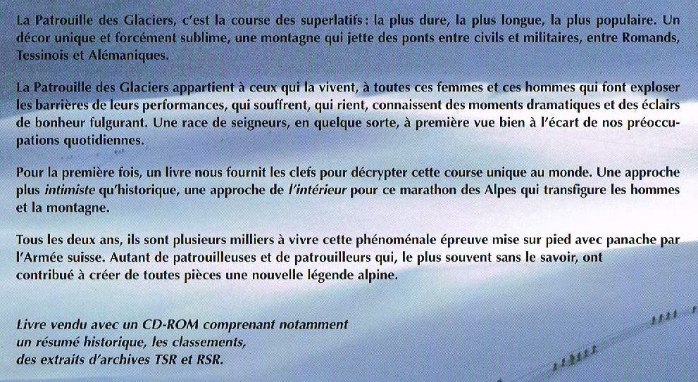 Patrouille des glaciers (la) - Une légende alpine | Aymon Benoît | Editions de l'Hèbe | Sans date | Relié - 30x24 - 132 pp - 1 kg 200 | Illustrations - Sans le CD - Verso | 5 | LC-3286 |